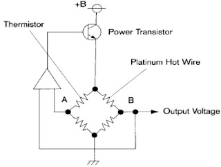 In above diagaram, the power transistor supplies voltage to wheat-stone bridge. The voltage is divided and dropped through to point A and B. As the engine revs up and the air flow increases and it cools the thermistor and lower its resistance. This means at point A the voltage goes up because more voltage is needed to drop across the second resistor. This increased voltage is then supplied to the non-inverting side of the differntial op-amp. Increasing its output which then goes to the base of the power transistor turning it on more and so supplying more current to the thermistor heating it back up to its previous temperature. This increasing current also flows through the platinum hot wire giving an increased signal to ECU.